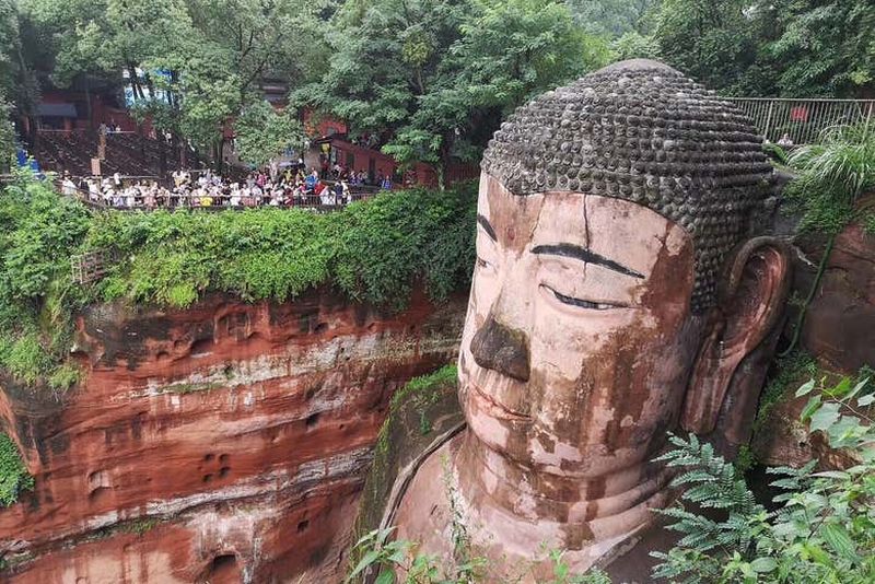 Commencée en 713 sous la dynastie Tang, la construction du Bouddha a nécessité près de 90 ans pour s’achever. Le projet était mené par un moine bouddhiste nommé Haitong, animé par le souhait de calmer les eaux tumultueuses des rivières Minjiang, Dadu et Qingyi. L’énorme statue mesure environ 71 mètres de haut, ce qui en fait à l’époque, et jusqu’à récemment, la plus grande sculpture de Bouddha en pierre du monde.