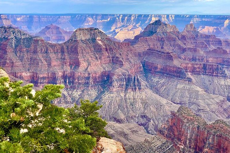 La North Rim, plus sauvage et reculée, propose des panoramas moins fréquentés mais tout aussi impressionnants. Point Imperial, culminant à 2 683 mètres, est le point le plus élevé du parc. Ce belvédère révèle des contrastes saisissants entre les couches rocheuses. Un peu plus loin, Cape Royal offre une vue grandiose embrassant le Colorado River et des falaises abruptes. Cette partie du canyon n’est accessible que de mi-mai à mi-octobre.