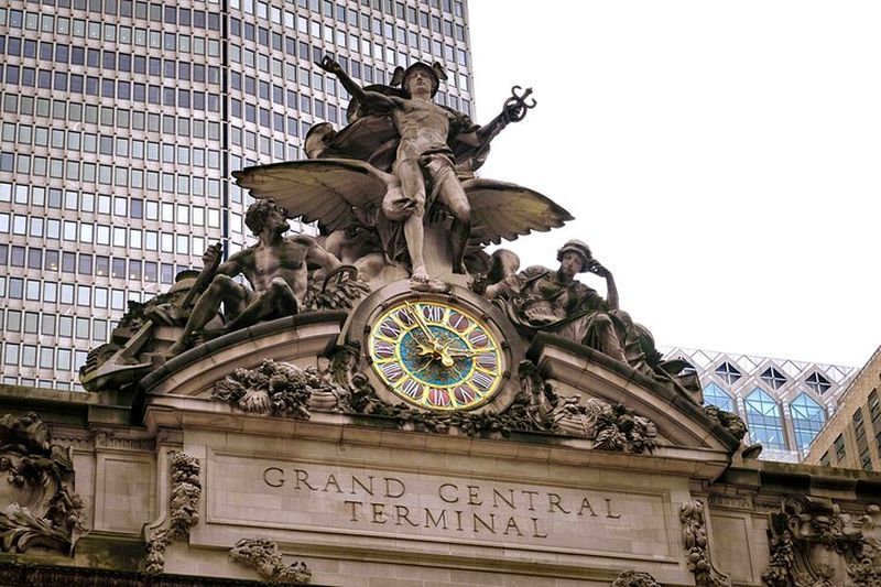 La façade extérieure de Grand Central Terminal est agrémentée d’une horloge Tiffany de 4 mètres de diamètre, installée en 1914. Au-dessus, des sculptures représentent Minerve, Hercule et Mercure, symbolisant la sagesse, la force et la rapidité. Conçues par le sculpteur Jules-Félix Coutan, elles composent l’un des plus grands groupes sculptés en Amérique. Cette façade néoclassique, tournée vers Park Avenue, évoque la magnificence des débuts du transport ferroviaire à New York.