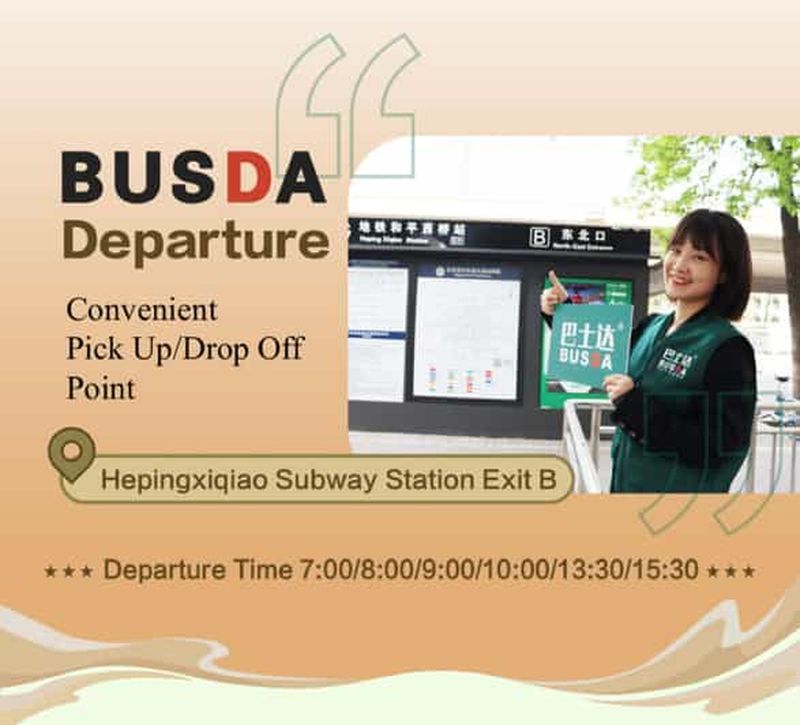 Cette option concerne les visites guidées en bus avec lieu de rendez-vous fixe à la sortie B de la station Hepingxiqiao (ligne de métro 5). L'excursion démarre à 7h00/8h00/9h00/10h00. La visite comprend un guide anglophone, les billets d'entrée et le transfert en bus. L'excursion n'inclut pas le déjeuner ni les téléphériques.