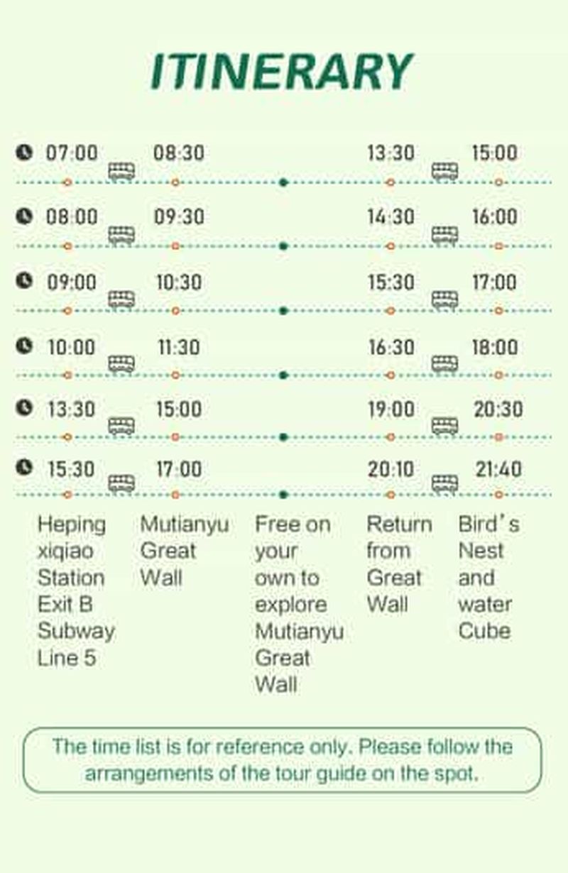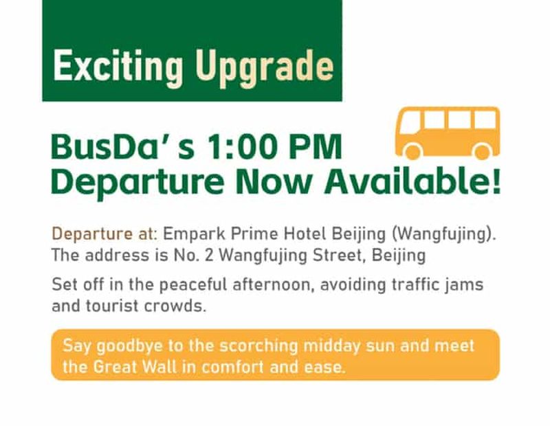 Cette option comprend des visites guidées en bus avec un lieu de rendez-vous fixe à la sortie A2 de la station Tiantandongmen (ligne 5 du métro). Le départ de la visite est prévu à 9h00. La visite comprend un guide anglophone, les billets d'entrée et les transferts en bus. L'excursion n'inclut pas le déjeuner ni les téléphériques.