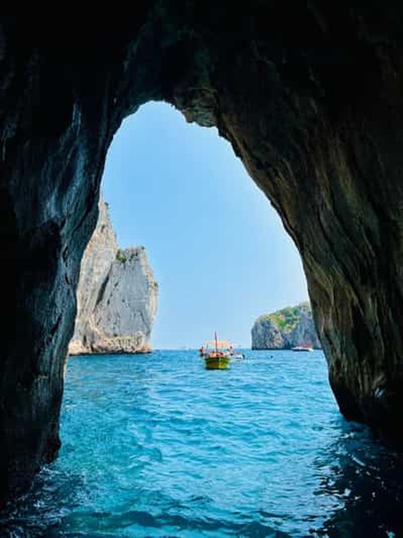 La balade en barque commence par le passage à travers une petite ouverture rocheuse, située à environ deux mètres au-dessus du niveau de la mer. Pour y accéder, il faut généralement s’allonger dans la barque afin de franchir l’accès étroit, utilisé depuis l’époque romaine. Le moment en lui-même ne dure que quelques minutes. Mais il demeure incontournable pour découvrir la magie et les reflets de la cavité.