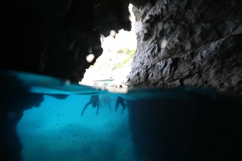 Entrez par une petite ouverture rocheuse, émerveillez-vous devant la lumière bleue et découvrez une atmosphère subaquatique incomparable.