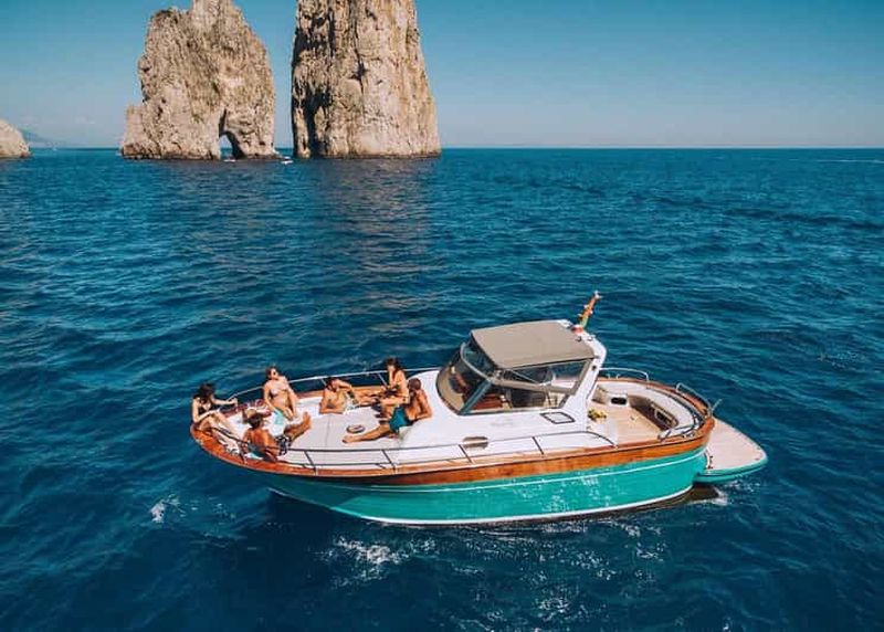 Explorez l'île de Capri de la meilleure façon : en bateau et en petit groupe. Naviguez le long de la côte, admirez les g...