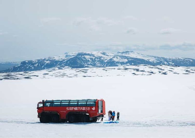 Partez à la découverte du Langjökull à bord d'un spacieux camion Glacier Red Monster Truck lors d'une visite guidée au d...