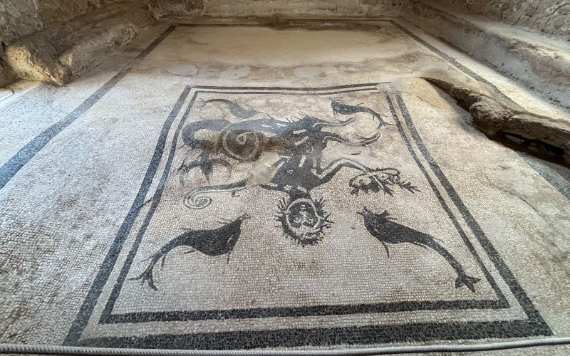 Derrière la mosaïque de Neptune, une fontaine privée coulait autrefois, un luxe à Herculanum.