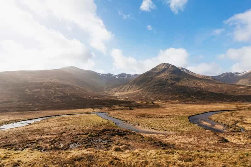 Les montagnes Cuillin se divisent en deux massifs, les Black Cuillin et les Red Cuillin, offrant un terrain de jeu exceptionnel pour les randonneurs et alpinistes. Leur point culminant, Sgùrr Alasdair, atteint 992 mètres, faisant de ce complexe montagneux l’un des plus hauts d’Écosse. Les sentiers varient en difficulté, présentant parfois des passages d’escalade. Par temps clair, vous profiterez de panoramas renversants sur l’Île de Skye et ses environs maritimes.