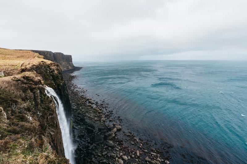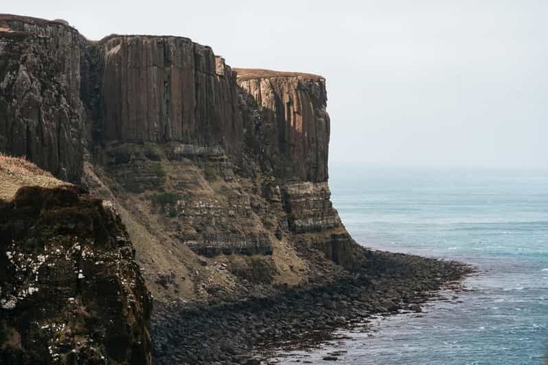 Kilt Rock, unique par sa formation basaltique évoquant les plis d’un kilt, surplombe la mer et atteint près de 60 mètres de hauteur. Au même point d’observation, Mealt Falls se jette directement dans l’océan, offrant un spectacle saisissant. Un chemin sécurisé permet d’apprécier pleinement cette cascade vertigineuse et la puissance de l’eau. Les jours de grand vent, vous entendrez la brume projetée sur la falaise, renforçant la magie des lieux.