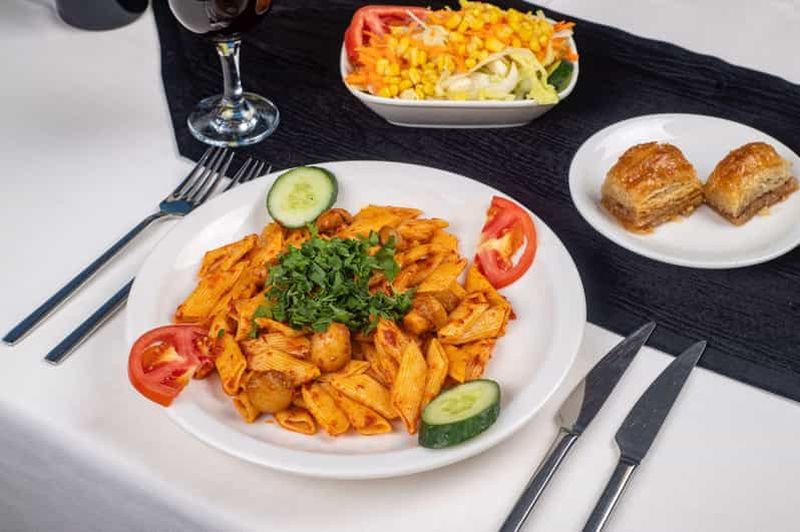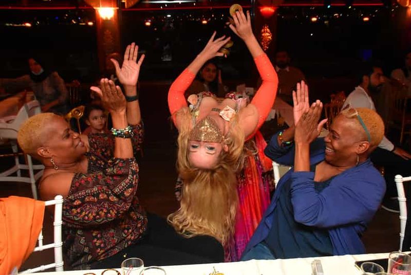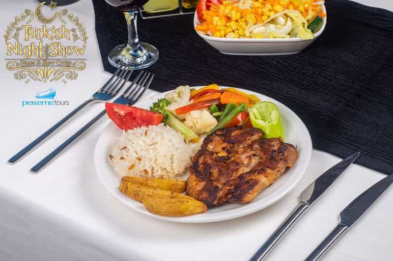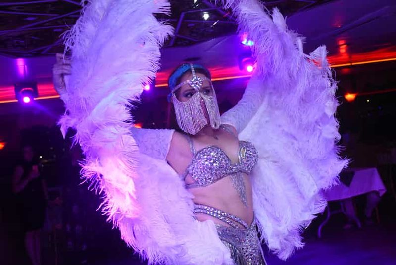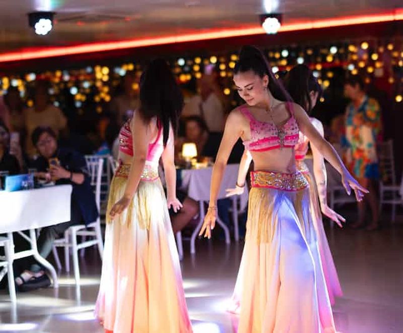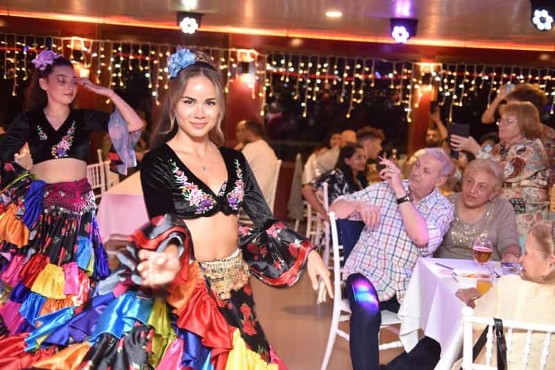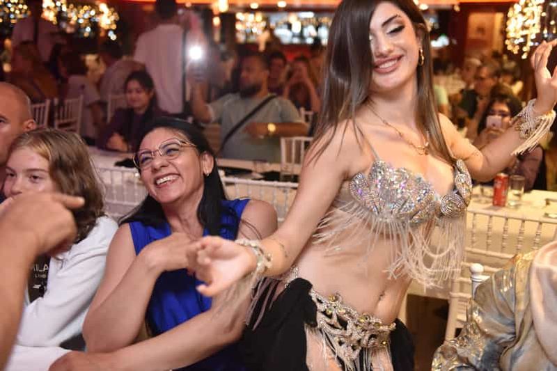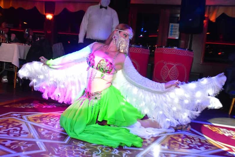 Repas : plateau d'hors-d'œuvre - salade fraîche de saison - boissons non alcoolisées à volonté - 3 plats principaux au choix - dessert. Spectacle : derviche tourneur - danse de bienvenue - danse romaine - danse du ventre en groupe - danse caucasienne - danse orientale en solo - danse régionale - dernière performance de DJ