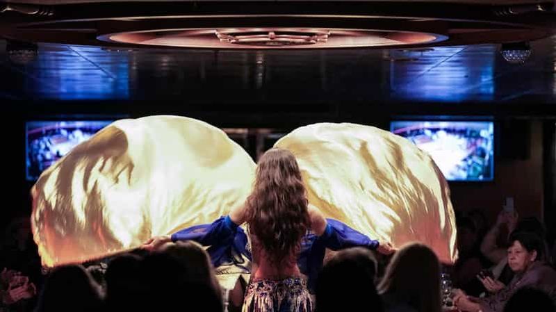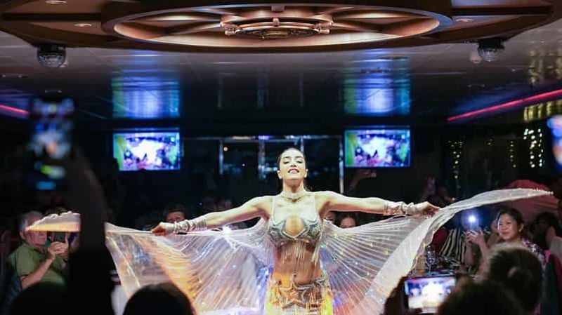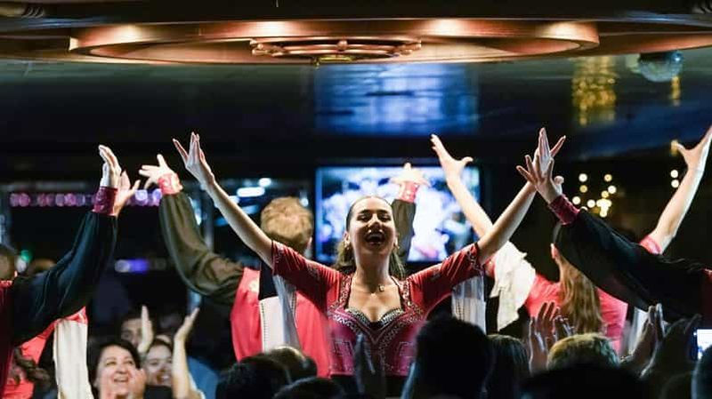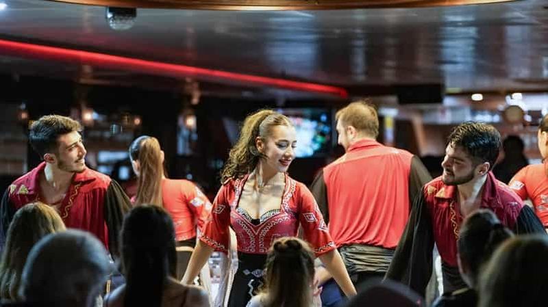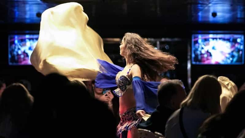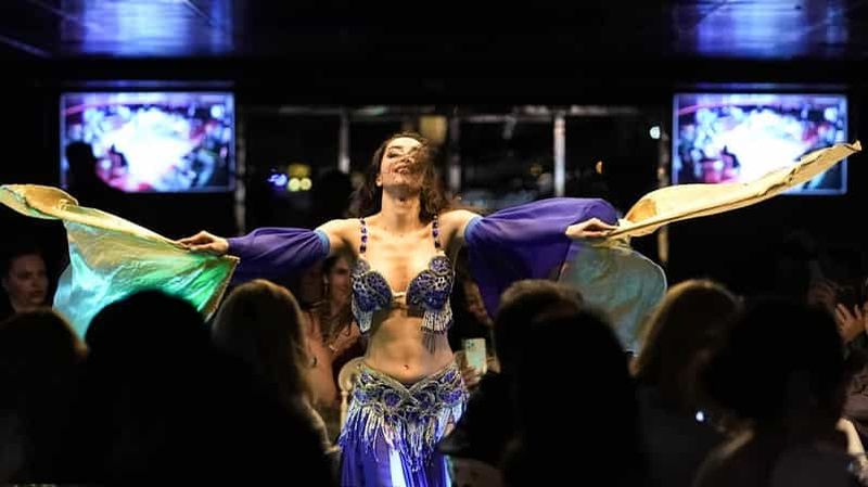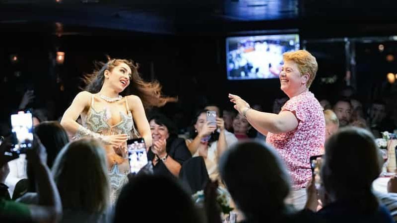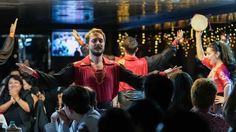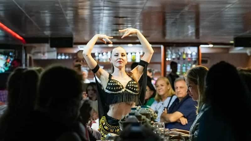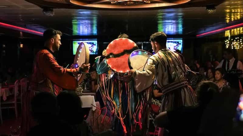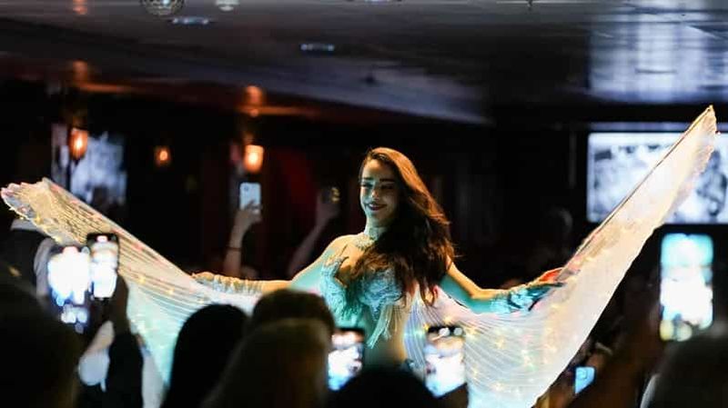 Profitez d'un vaste menu pour le dîner (poulet à la sauce curry, poulet grillé, bœuf sauté, daurade grillée, falafels et options végétariennes), de boissons non alcoolisées à volonté et de tables VIP garanties à proximité de la scène, avec des spectacles turcs nocturnes et un DJ professionnel.
