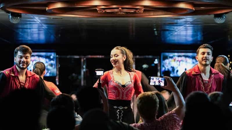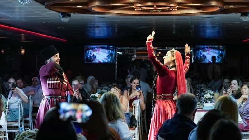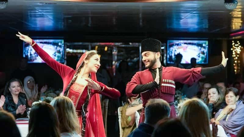 Profitez d'un dîner-croisière sur le Bosphore avec un délicieux menu et des spectacles turcs nocturnes. Comprend des boissons non alcoolisées et deux verres de boissons alcoolisées par personne (bière, vin, vodka, gin et raki). Les places sont attribuées de manière standard et le choix de la table n'est pas disponible.