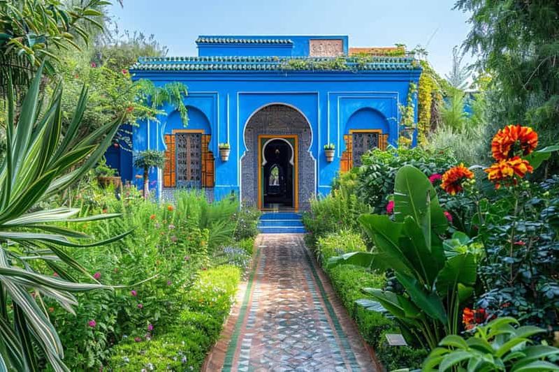 En 1923, le peintre français Jacques Majorelle acquiert une parcelle de terre à Marrakech. Il se met à rêver d’un jardin exotique où l’art et la nature fusionneraient harmonieusement. L’architecte Paul Sinoir construit alors la célèbre villa Art déco bleue, résidence majestueuse connue sous le nom de « bleu Majorelle ». Grâce à ses voyages, Majorelle a réuni plus de 300 espèces de plantes venant de cinq continents, transformant son rêve en véritable chef-d’œuvre botanique.