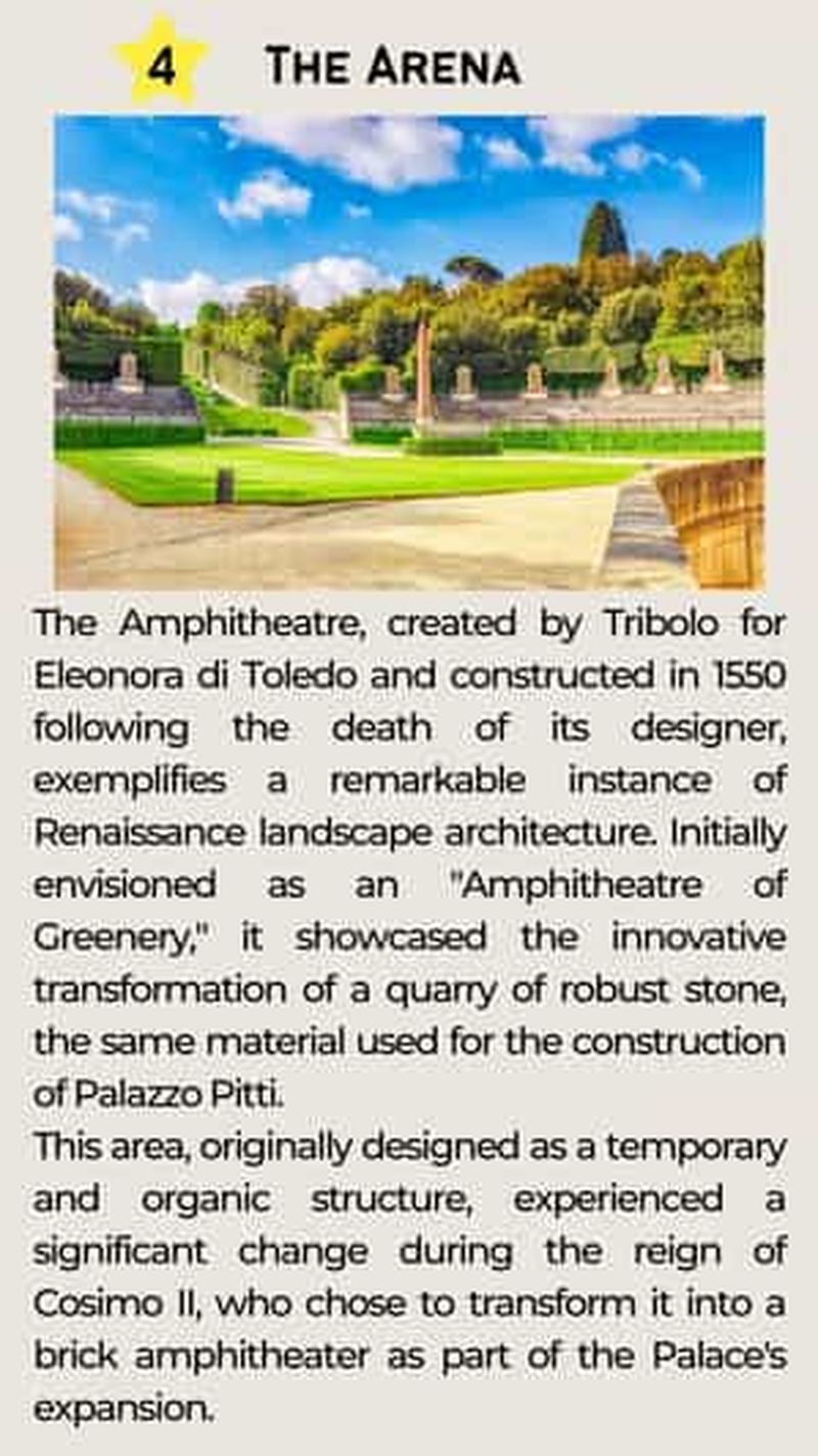 L’Amphithéâtre et l’Obélisque égyptien remontent respectivement aux XVIe et XVIIIe siècles. L’amphithéâtre, jadis lieu de divertissements grandioses, est orné de statues antiques évoquant la richesse culturelle de Florence. Au centre, se dresse l’obélisque, ramené d’Égypte au XVIe siècle pour agrémenter ce décor majestueux. Vous apprécierez l’atmosphère historique qui règne ici, tout en admirant la vue spectaculaire sur le Palais Pitti et les alentours. Un lieu incontournable de la splendeur Renaissance.