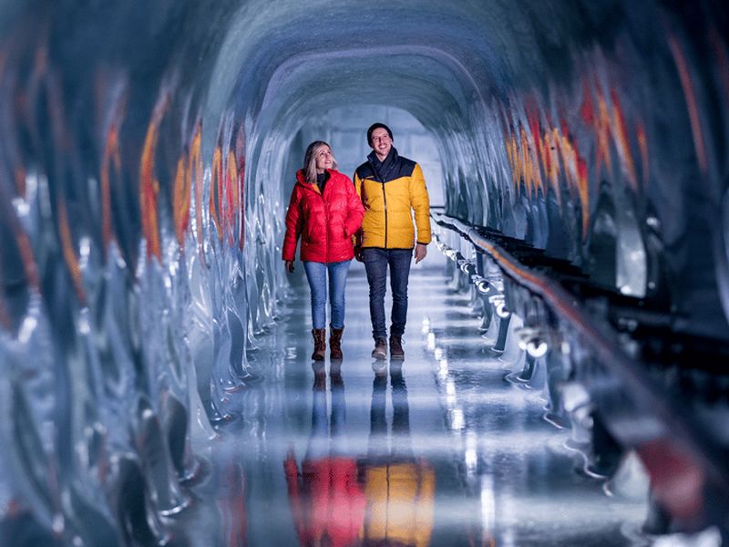 Le Palais de glace, creusé à plus de 20 mètres sous la surface du glacier, propose un voyage étonnant au cœur de la glace éternelle depuis les années 1930. Initialement créé par deux guides de montagne locaux, ce labyrinthe fascinant dévoile divers couloirs et sculptures de glace éclairées de manière envoûtante. L’ambiance y est maintenue à une température avoisinant –3 °C, assurant la solidité des parois et offrant un décor féérique.