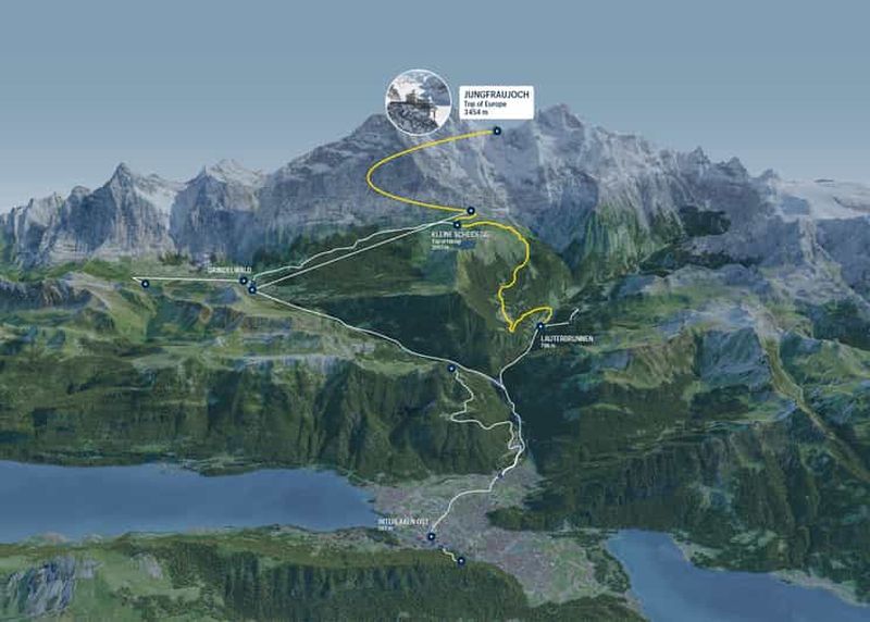 Ce tableau récapitule les différents moyens de transport pour rejoindre Jungfraujoch, en indiquant les points de départ et les correspondances essentielles.