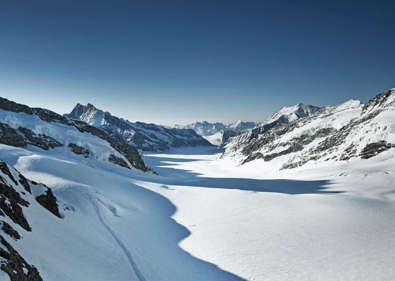 Le vaste plateau enneigé, accessible directement depuis la gare du Jungfraujoch, vous permet de fouler la neige en toute saison. Situé à plus de 3 400 mètres d’altitude, cet espace unique offre des panoramas immaculés sur la chaîne des Alpes suisses. Vous pourrez y marcher, observer de près les séracs et profiter d’un air pur, tout en admirant le sublime contraste entre le ciel d’azur et l’étendue blanche qui l’entoure.