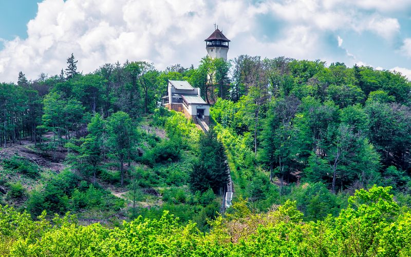 Édifiée en 1914 sur la colline de Freundschaft, la tour Diana offre, depuis ses 547 mètres d’altitude, une vue panoramique sur Karlovy Vary, accessible à pied ou par funiculaire depuis la partie basse de la ville.