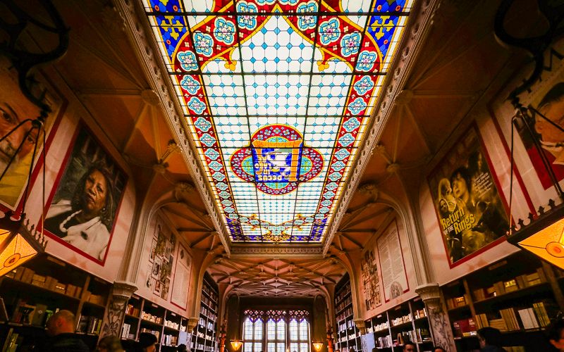 Le vitrail coloré du plafond, conçu au début du XXe siècle, illumine l’intérieur de la Librairie Lello d’un halo. Orné d’arabesques et du slogan « Decus in Labore », il reflète l’esprit de travail et de raffinement que l’on retrouve dans l’ensemble du bâtiment. Vous serez captivé par la lumière chatoyante qui se diffuse à travers ses verres peints, offrant une ambiance propice à la découverte et à la lecture.