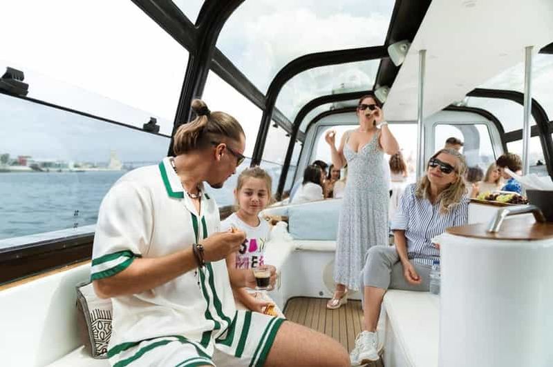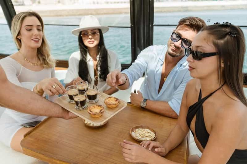 Commencez votre journée sur un bateau de luxe avec une croisière relaxante le long du Tage. Savourez un café authentique, un pastel de nata et admirez peut-être des dauphins. En cas de pluie, le bateau se ferme en verre pour plus de confort.