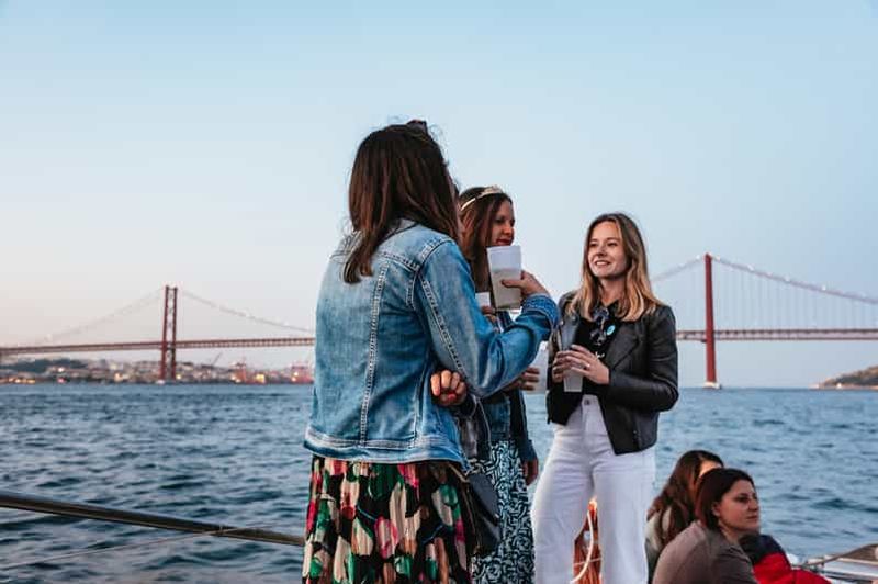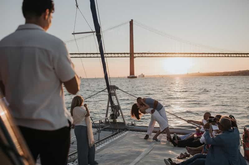 Embarquez pour une croisière en catamaran au coucher du soleil sur le Tage. Savourez une boisson à bord, détendez-vous s...