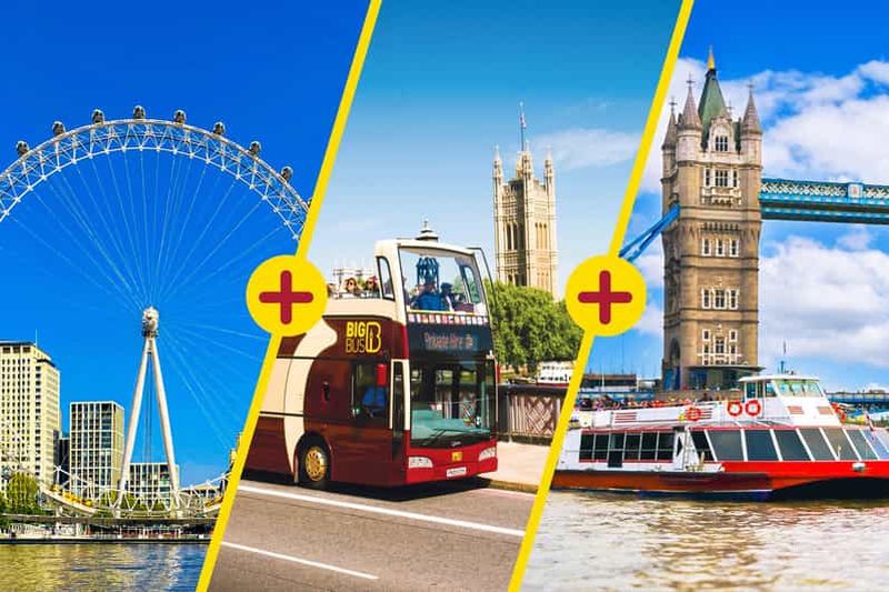 Cette option comprend un billet d'entrée horodaté au London Eye, une croisière à sens unique sur la Tamise et un billet de visite touristique Big Bus à arrêts multiples de 24 heures.