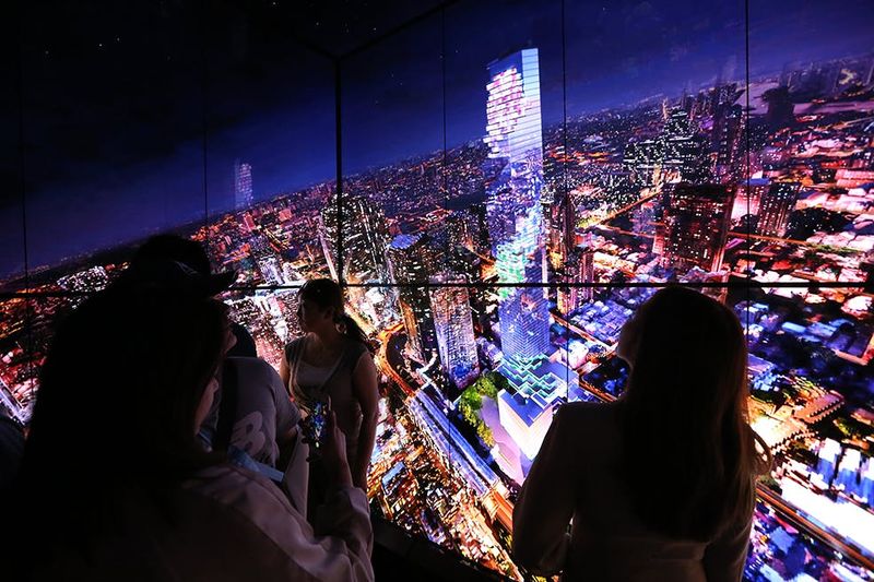 Dès votre arrivée, vous serez guidé vers le hall d’accueil immersif, inauguré en 2018 pour transformer chaque instant en aventure sensorielle. Des projections lumineuses et effets sonores dynamiques vous transportent au cœur de Bangkok. Conçu pour attiser votre curiosité, ce vaste espace mêle modernité et traditions. Vous pourrez y découvrir des informations sur la construction de la tour ainsi que sur les principaux quartiers de la capitale. Un accueil spectaculaire.