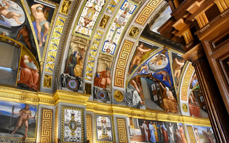 La bibliothèque royale fut créée pour réunir les manuscrits, les incunables et les ouvrages scientifiques collectés par Philippe II au fil de ses campagnes. Ses étagères de bois finement sculpté abritent des trésors littéraires inestimables, dont certains datent des premiers temps de l’imprimerie. Les fresques ornant sa voûte illustrent les arts, les sciences et les disciplines intellectuelles. En y pénétrant, vous plongerez dans l’univers humaniste de la Renaissance, témoin de l’ambition culturelle royale.