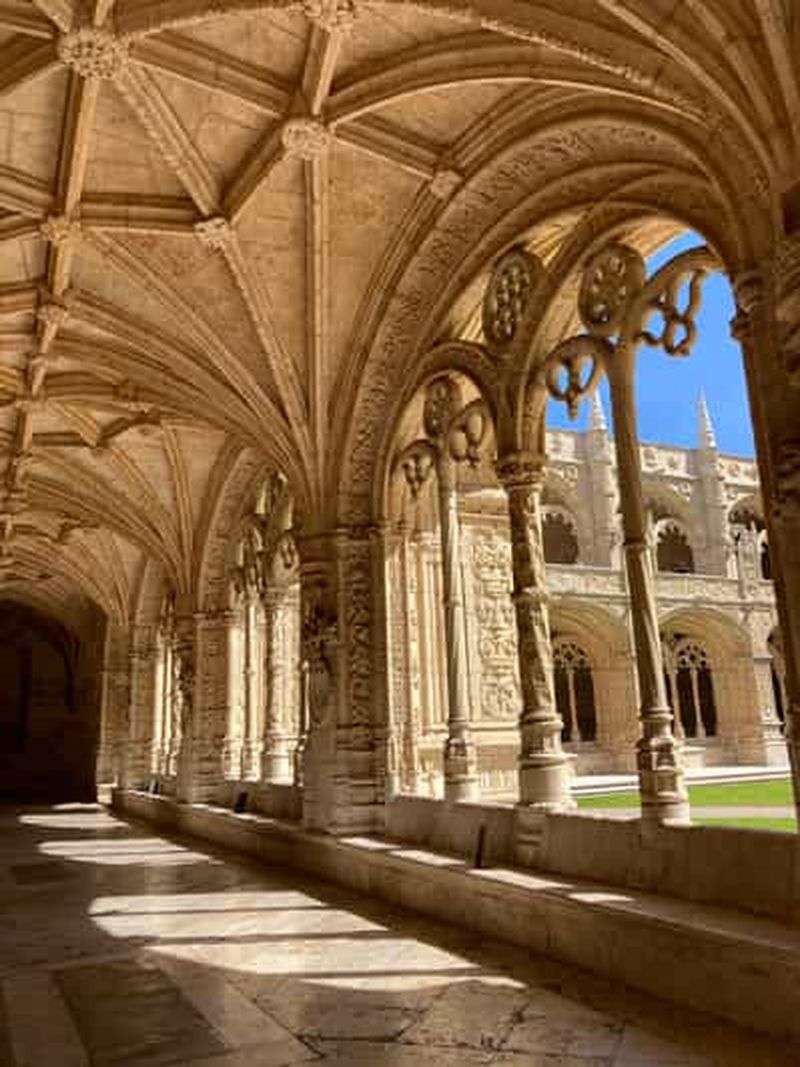 Les arcades mêlent dentelles de pierre et motifs marins, échos des grandes explorations portugaises