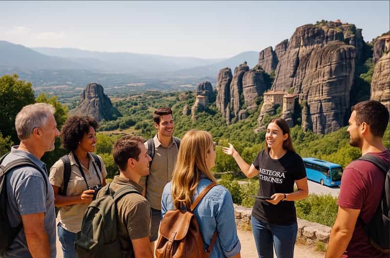 Choisissez cette option pour un transfert en bus confortable depuis Athènes. Visite en petit groupe des Météores avec un guide anglophone de la région, incluant un déjeuner grec. Choisissez entre 10 plats et des options végétariennes sont également disponibles. Audioguide gratuit inclus.