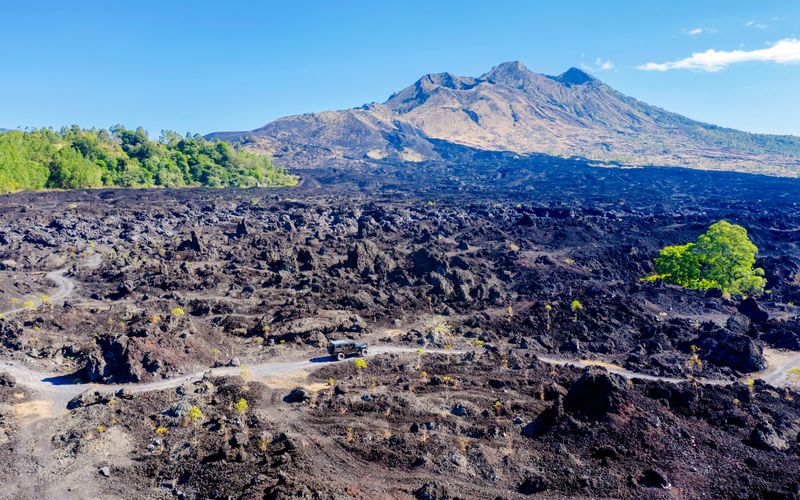 Le cratère principal de mont Batur résulte d’éruptions successives, la plus récente datant de 2000, qui ont façonné des champs de lave noire spectaculaires. On y observe encore d’intenses fumerolles témoignant d’une activité volcanique persistante. Les coulées de lave solidifiées entourent la caldeira depuis la violente éruption de 1963, créant un paysage lunaire unique. Sur place, vous ressentirez la chaleur émanant du sol, preuve de la puissance toujours présente du volcan.