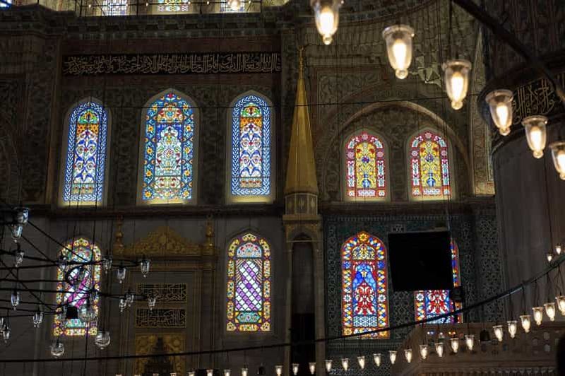 Les lustres monumentaux illuminent la salle de prière. Ils sont suspendus à de longues chaînes descendant du dôme. Conçus pour diffuser la lumière de manière uniforme, ces pièces imposantes participent à l’atmosphère paisible. Jadis, elles étaient alimentées par des bougies ou des lampes à huile, dont la fumée se mêlait aux parfums d’encens. Aujourd’hui, l’éclairage électrique souligne leur élégance et offre un spectacle visuel captivant.
