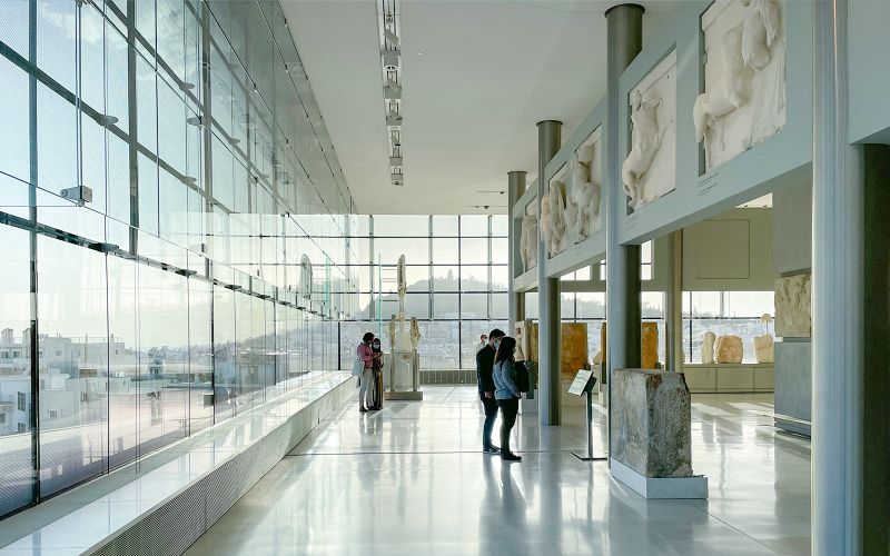 Le dernier étage du musée reprend volontairement l’orientation exacte du Parthénon voisin. Cette galerie vitrée abrite la frise et les métopes, présentées selon l’agencement initial voulu par les Anciens. Cet effet d’alignement permet de mieux appréhender pleinement l’influence visuelle du temple original, tout en soulignant la cohérence architecturale du site.