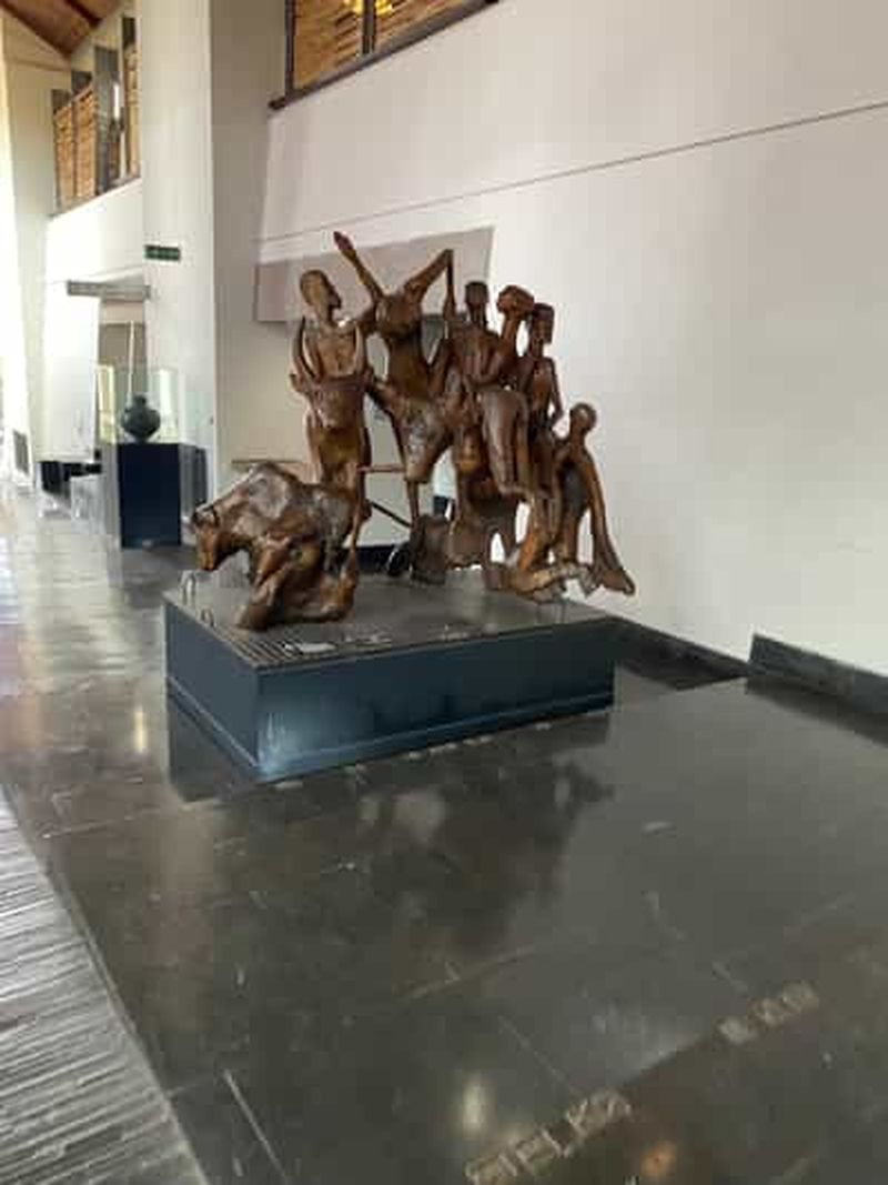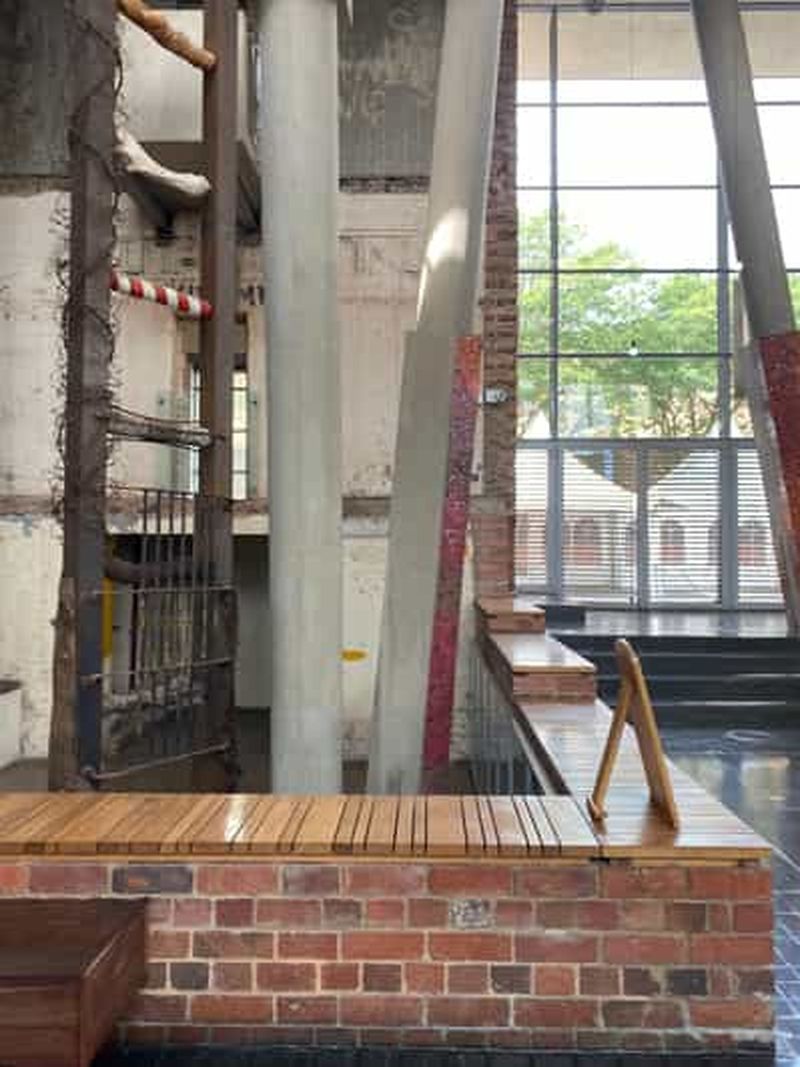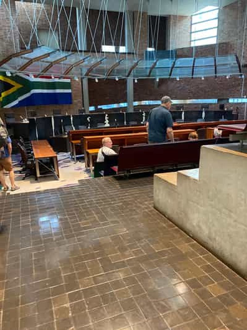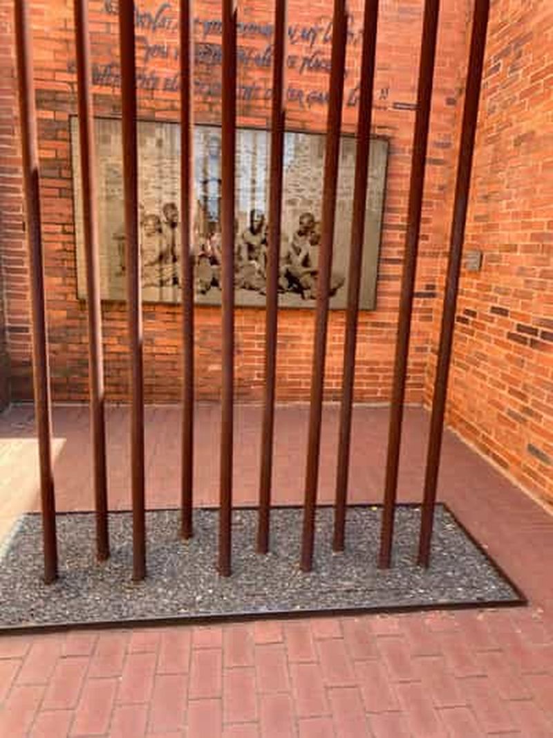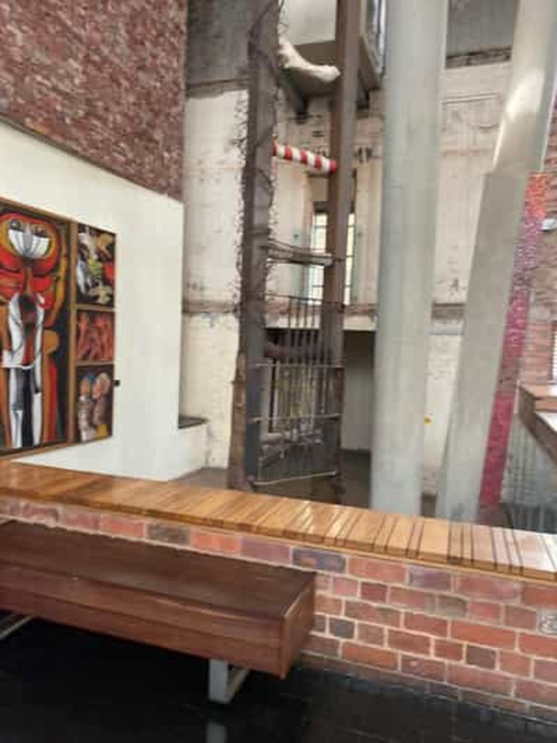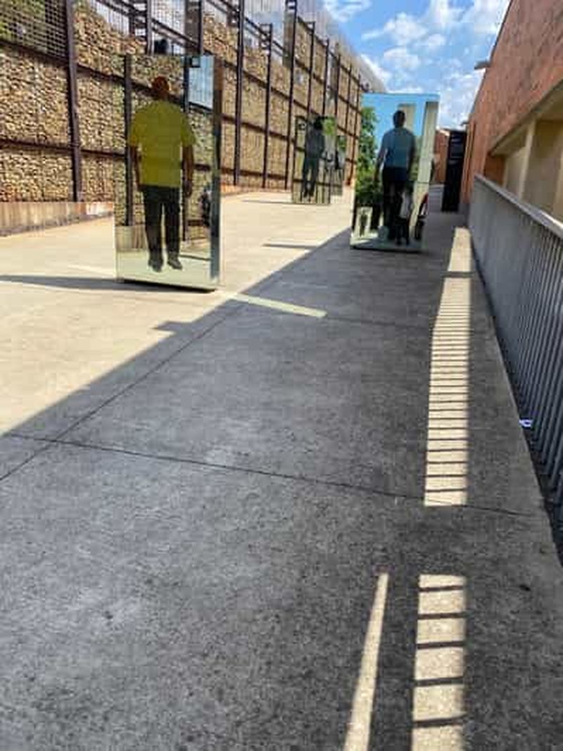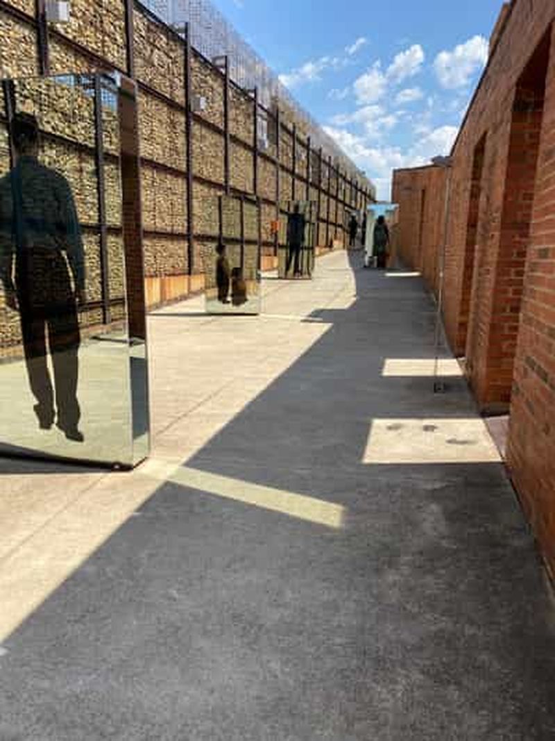 À l’extérieur, sept piliers monumentaux représentent les valeurs fondamentales de la Constitution sud-africaine : démocratie, égalité, réconciliation, diversité, responsabilité, respect et liberté. Adoptée en 1996, cette Constitution transforme le paysage légal du pays en abolissant l’apartheid. Chaque pilier est assorti d’un texte explicatif, rappelant les défis surmontés pour garantir ces droits.