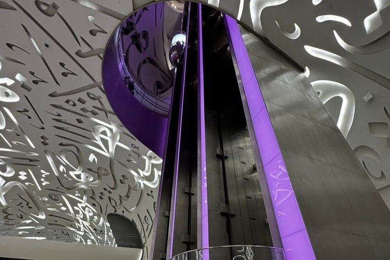 Sur la façade, les inscriptions calligraphiques forment des messages en arabe, extraits des discours de Son Altesse le Cheikh Mohammed bin Rashid Al Maktoum. Réalisées par l’artiste émirati Mattar bin Lahej, elles reflètent la volonté de transmettre sagesse et optimisme.