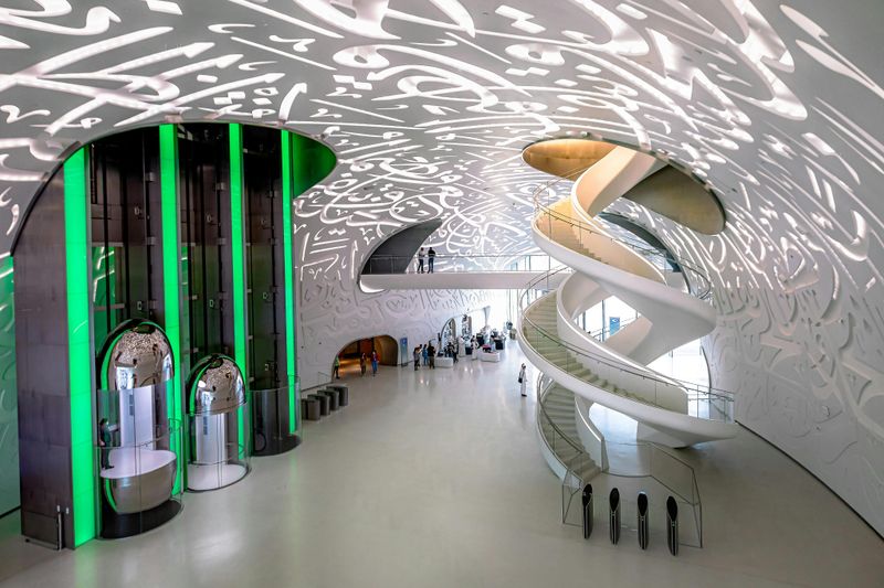 Sur la façade, les inscriptions calligraphiques forment des messages en arabe, extraits des discours de Son Altesse le Cheikh Mohammed bin Rashid Al Maktoum. Réalisées par l’artiste émirati Mattar bin Lahej, elles reflètent la volonté de transmettre sagesse et optimisme.