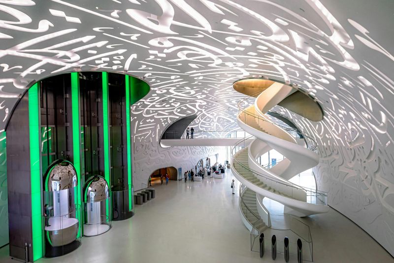 Sur la façade, les inscriptions calligraphiques forment des messages en arabe, extraits des discours de Son Altesse le Cheikh Mohammed bin Rashid Al Maktoum. Réalisées par l’artiste émirati Mattar bin Lahej, elles reflètent la volonté de transmettre sagesse et optimisme.