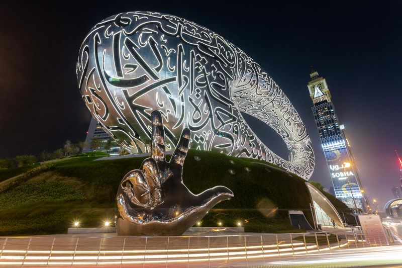 L’architecture plébiscitée du Musée du Futur est une œuvre d’art en elle-même. Sa construction a débuté en 2016 et a duré plusieurs années, s’achevant officiellement en 2022. Ce joyau architectural est recouvert de plus de 1000 panneaux d’acier inoxydable, ornés de calligraphies arabes lumineuses, ce qui en fait une merveille technologique autant qu’artistique. La construction a exigé des solutions de pointe en ingénierie et en design pour donner vie à cette vision futuriste.
