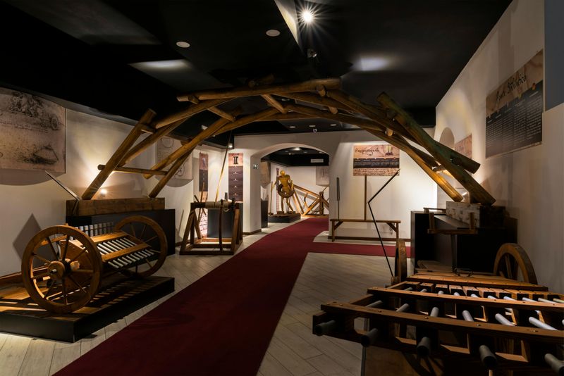 Durant ses années milanaises au service de Ludovic Sforza, entre 1482 et 1499, Léonard conçut d’impressionnantes machines de guerre. Le musée présente des répliques de ces dispositifs militaires : chars blindés aux allures de tortues métalliques, arbalètes géantes à tir multiple, ponts démontables pour traversées rapides. Ces innovations, souvent trop ambitieuses pour leur époque, illustrent comment l’esprit pragmatique de l’ingénieur répondait aux exigences stratégiques des princes italiens de la Renaissance.
