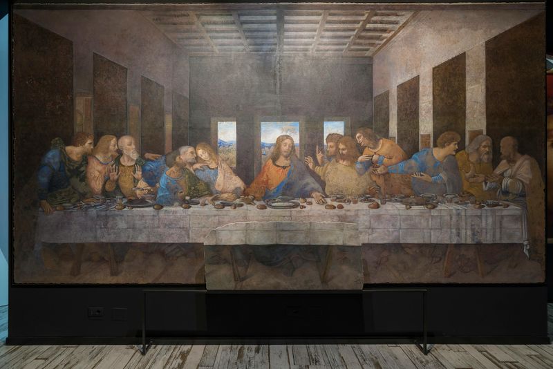 Une reproduction de La Cène permet d’apprécier cette œuvre magistrale peinte entre 1495 et 1498 pour le réfectoire du couvent milanais Santa Maria delle Grazie. Cette version facilite la contemplation des détails : les expressions contrastées des apôtres au moment où le Christ annonce sa trahison, la perspective architecturale qui prolonge l’espace du réfectoire, les gestes suspendus qui racontent une tension dramatique. L’original, fragilisé par la technique expérimentale de Léonard et les restaurations successives, reste difficilement accessible à Milan.