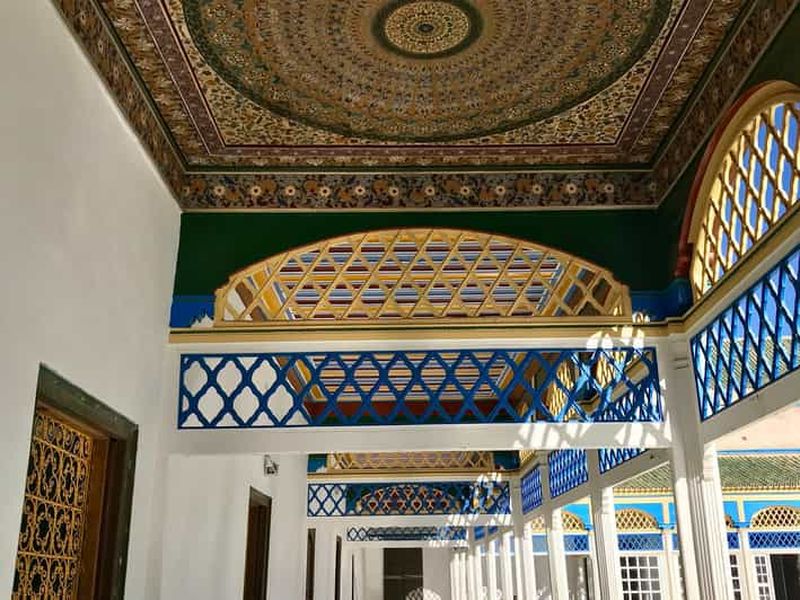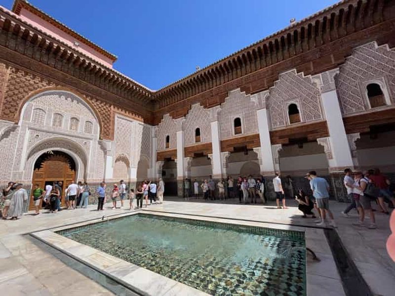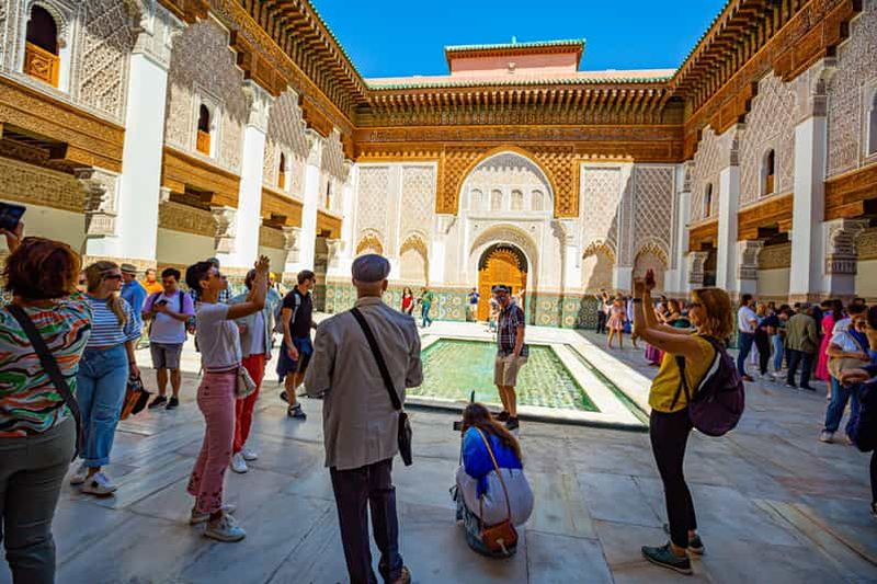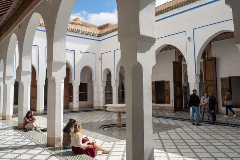 Participez à cette excursion en petit groupe dirigée par un guide anglophone agréé. L'excursion commence au Café de France sur la place Djemaa El Fna. VEUILLEZ NOTER : Les billets d'entrée au Palais de la Bahia et à la Madrassa Ben Youssef ne sont pas inclus et doivent être payés en espèces.