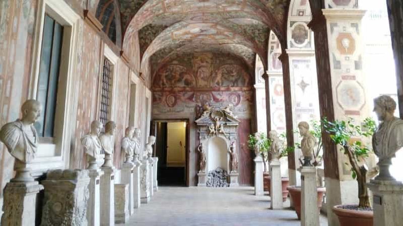 Une vaste cour accueille une exposition de sculptures romaines issues de diverses fouilles urbaines menées à travers les siècles. Bustes impériaux, reliefs narratifs et fragments architecturaux sont présentés selon un principe muséal hérité du XIXe siècle, offrant un espace lumineux propice à la contemplation. Cette disposition permet d’observer l’évolution des styles et des techniques sculptées, de la République à l’Empire tardif, dans un cadre qui favorise la comparaison et la compréhension.