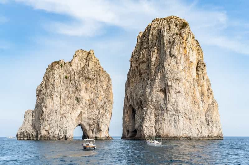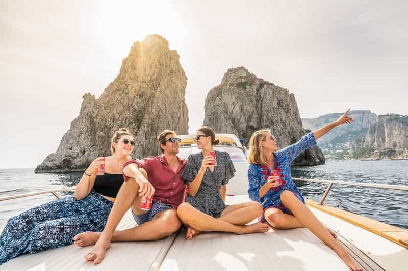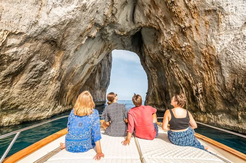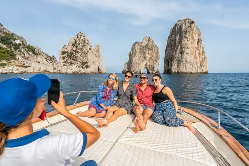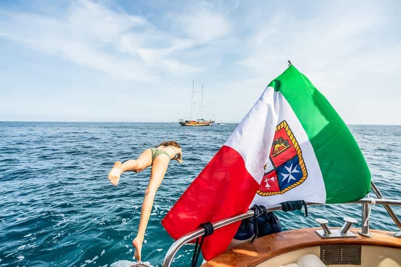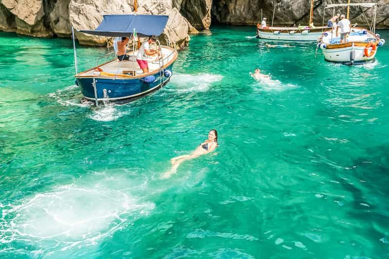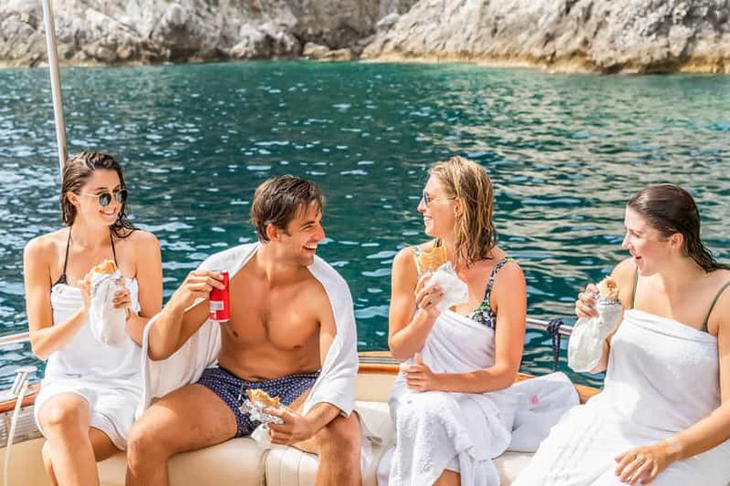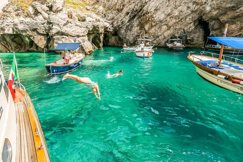 Départs avec deux arrêts pour la baignade pendant l'excursion et arrêt à la Grotte Bleue uniquement si la file d'attente ne dépasse pas 30 minutes. Durée de l'excursion : environ 7 heures, possibilité de prise en charge dans la région de Sorrente.