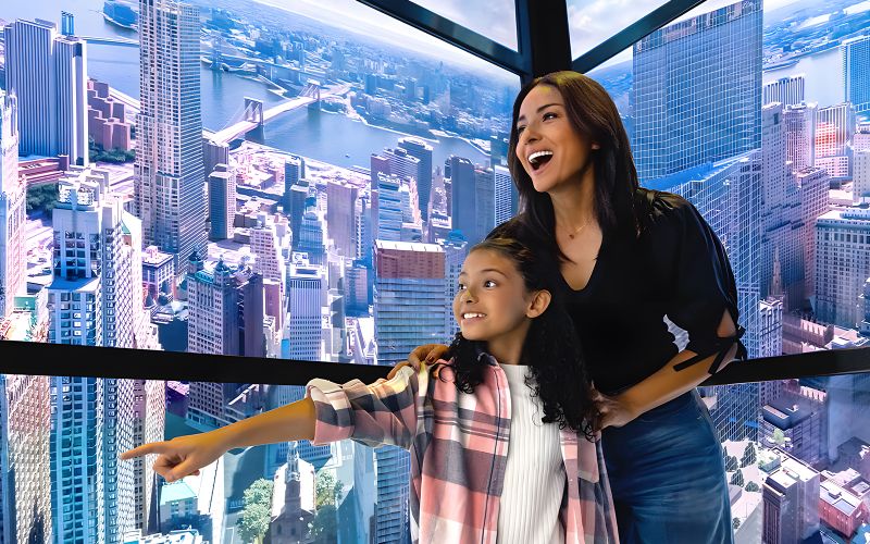 La montée à bord des Sky Pods ne se limite pas à la vitesse. Une animation panoramique impressionnante y reconstitue cinq siècles d’évolution de la ville, depuis ses origines jusqu’à la métropole moderne. En moins d’une minute, vous visualisez la croissance vertigineuse de New York, comme si vous y étiez.