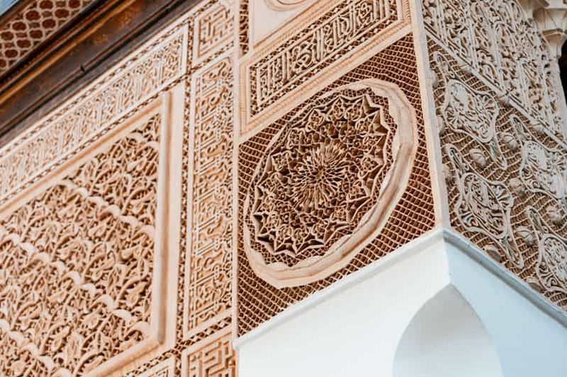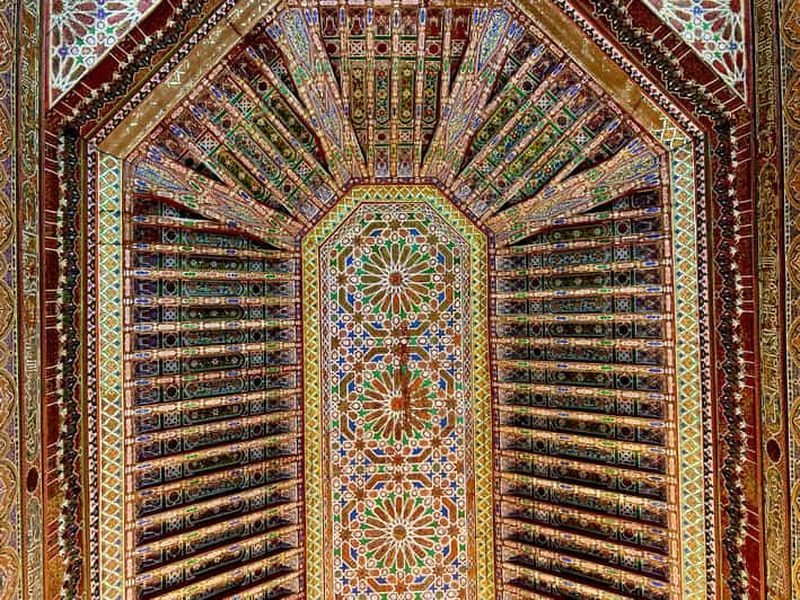 Mettez le pied dans l’entrée du Palais, édifié vers la fin du XIXe siècle par le vizir Ba Ahmed. Sa porte monumentale, finement ornée de motifs floraux, vous accueille dans un décor majestueux. Les boiseries peintes, héritées de l’art marocain traditionnel, témoignent de la richesse de ce lieu. Observez chaque détail et imprégnez-vous de l’atmosphère d’antan avant de poursuivre la découverte des merveilles architecturales qui font la réputation du site.
