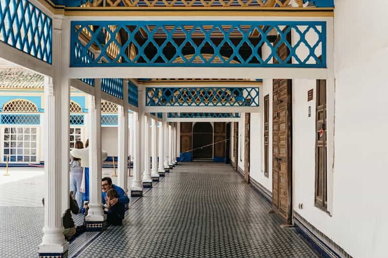 Mettez le pied dans l’entrée du Palais, édifié vers la fin du XIXe siècle par le vizir Ba Ahmed. Sa porte monumentale, finement ornée de motifs floraux, vous accueille dans un décor majestueux. Les boiseries peintes, héritées de l’art marocain traditionnel, témoignent de la richesse de ce lieu. Observez chaque détail et imprégnez-vous de l’atmosphère d’antan avant de poursuivre la découverte des merveilles architecturales qui font la réputation du site.