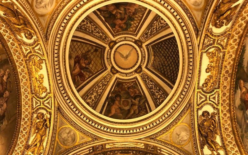 Le Palais Barberini est reconnu pour son escalier monumental en colimaçon conçu par Borromini et sa célèbre salle de bal où se trouve un somptueux plafond peint par Pietro da Cortona. Cette fresque, représentant « Le Triomphe de la Divine Providence », est un exemple spectaculaire de l’art baroque, exaltant la gloire papale à travers une pléthore de figures allégoriques.