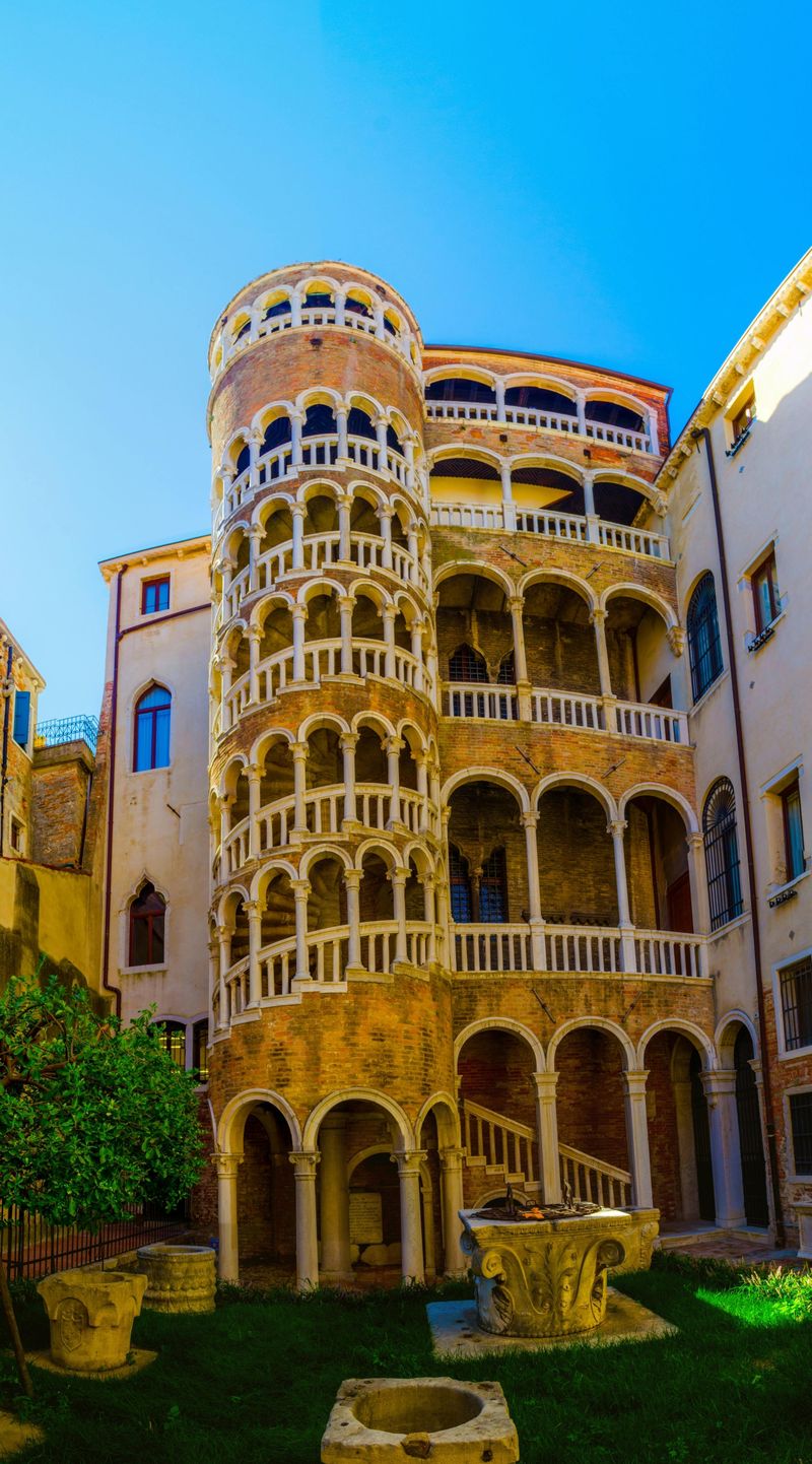 L’escalier baptisé “bovolo” (escargot en dialecte vénitien) fut érigé à la fin du XVe siècle pour la noble famille Contarini. Enrichi de colonnes de style Renaissance et construit en briques, il constitue un chef-d’œuvre d’architecture et un défi technique pour l’époque. Aujourd’hui, grimper ses marches vous plonge dans l’histoire de Venise tout en vous offrant, à chaque palier, des points de vue uniques sur la cour intérieure et la cité.