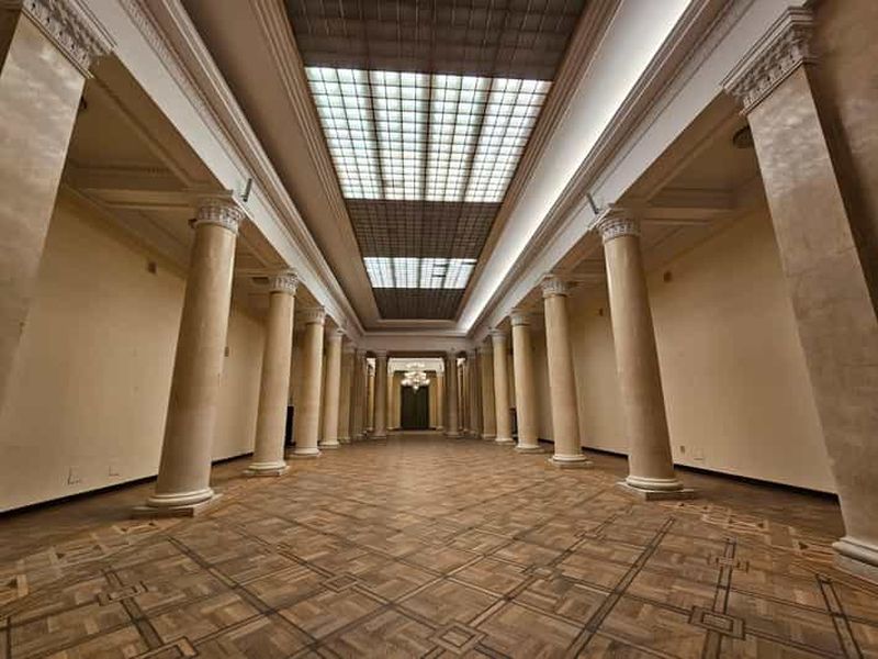 Le grand hall d’entrée se distingue par son architecture monumentale, conçue dans un style inspiré du réalisme socialiste. Inauguré en 1955, ce vaste espace offre un aperçu de la majesté du bâtiment, qui culmine à 237 mètres de hauteur. Les colonnes ornées et le marbre au sol soulignent l’ambition de l’époque. Vous y trouverez un point d’information touristique, des guichets pour les visites guidées et l’accès à divers étages culturels.