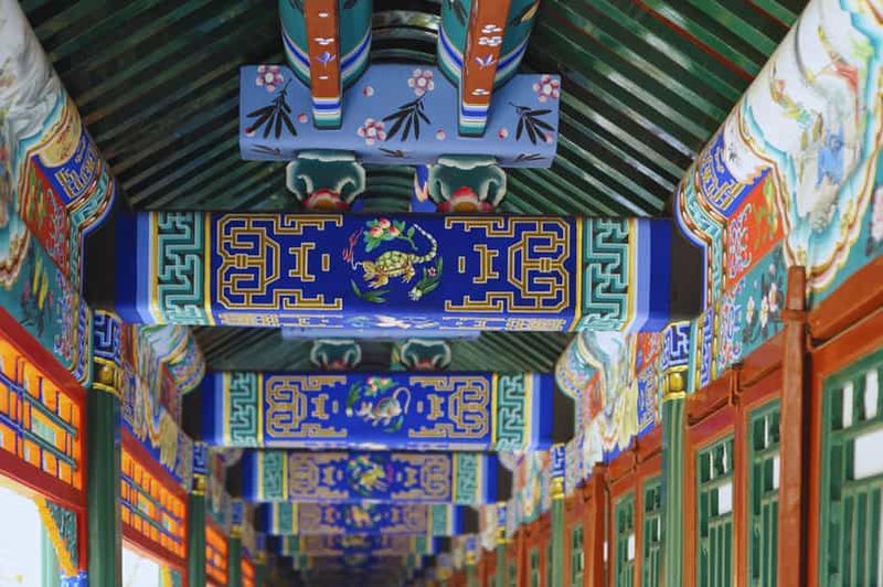 Le long corridor est considéré comme le plus long couloir peint au monde. En effet, il s’étend sur environ 728 mètres. Il est orné de couleurs vives et de scènes légendaires. Construit pour permettre à l’empereur de se promener même par mauvais temps, il offre aujourd’hui une promenade spectaculaire.