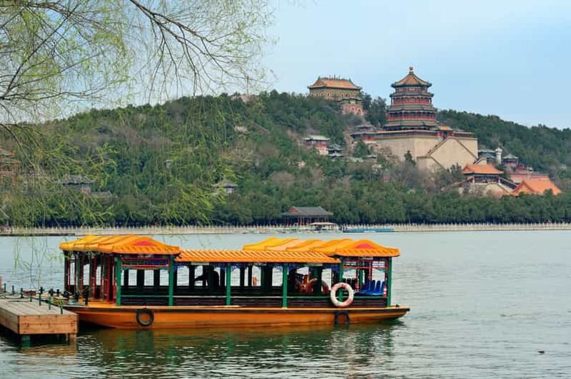 Le Bateau de Marbre au bord du lac est en réalité une base de pierre surmontée d’une structure en bois peinte pour imiter la pierre. On raconte que l’impératrice Cixi détourna partiellement des fonds navals pour le financer, suscitant un scandale au sein de la cour impériale.